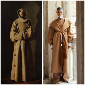 При помощи современных тканей и аксессуаров этот образ становится современным. Посмотрите, как в образе из коллекции Max Mara 2025 года можно проследить мотивы картины испанского художника Зурбарана Святой Франциск (1636 г)